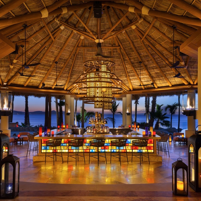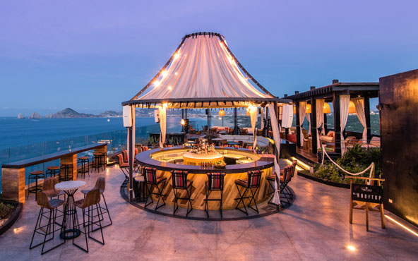 The Rooftop at The Cape, A Thompson Hotel, comes alive when the sun goes down. This open-air oasis offers sweeping views of El Arco and the twinkling lights of Cabo San Lucas. The ambience is accentuated with sunken seating areas, a warming fire pit, and tranquil water views. The mixologists create handcrafted cocktails and serve up artisanal beers from the local region. Try The Cape, a mixture of basil and mint–infused mezcal, pineapple, lemon, grapefruit, and angostura bitters; a Sunset Spritz made with prosecco, Aperol, St-Germain, and orange; or an Herbal Espresso Martini that combines espresso, Nixta, Żubrówka vodka, and angostura bitters. Appetizers include shrimp popcorn or an heirloom tomato salad. There are also several main courses, but the Rooftop double cheeseburger is always a big hit.