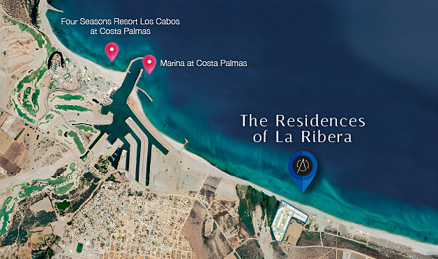 Nestled along the shores of the azure blue sea of Cortés, The Residences of La Ribera is a private and exclusive beachfront community featuring 52 coveted lots. It has over 1,320 feet (402 mts) of wide sandy beach and is adjacent to Costa Palmas, the Marina, Aman, and Four Seasons resort.